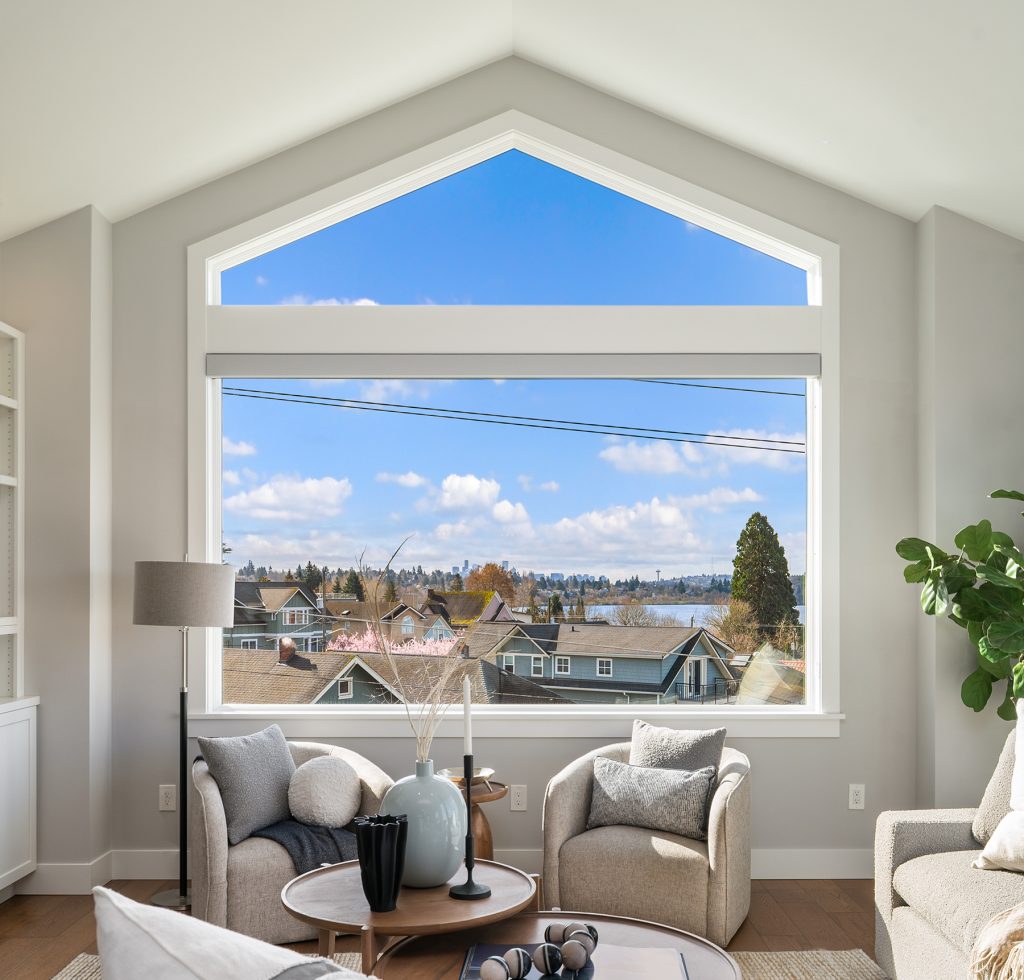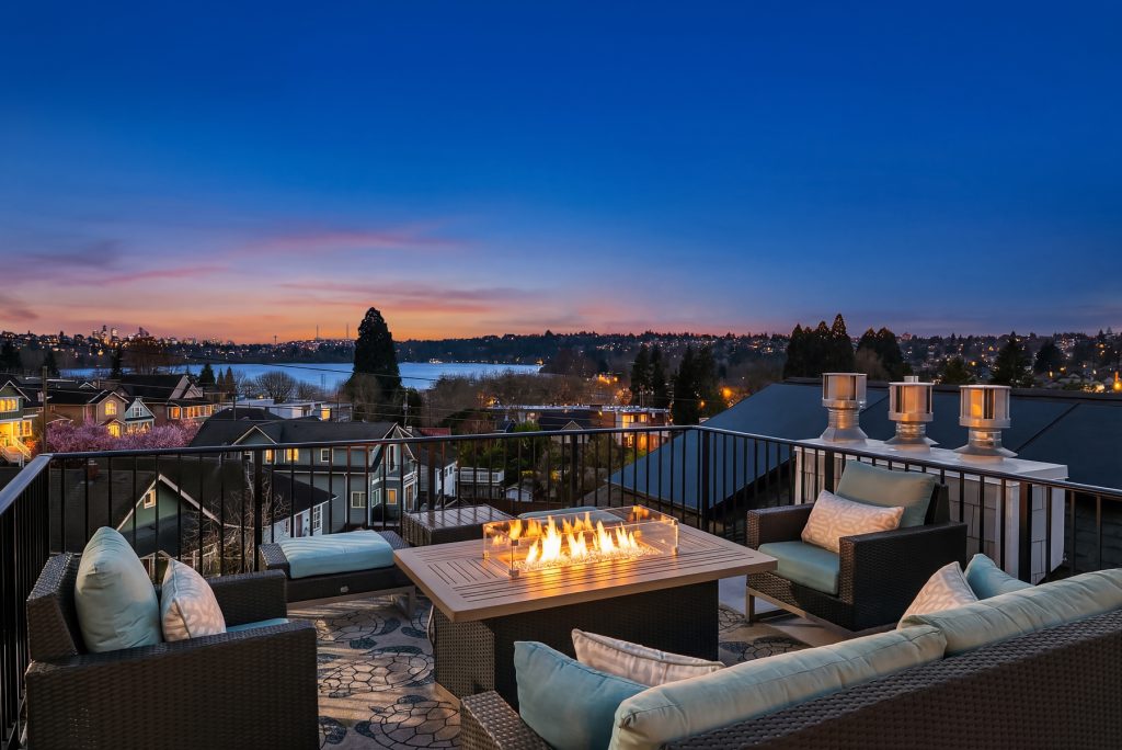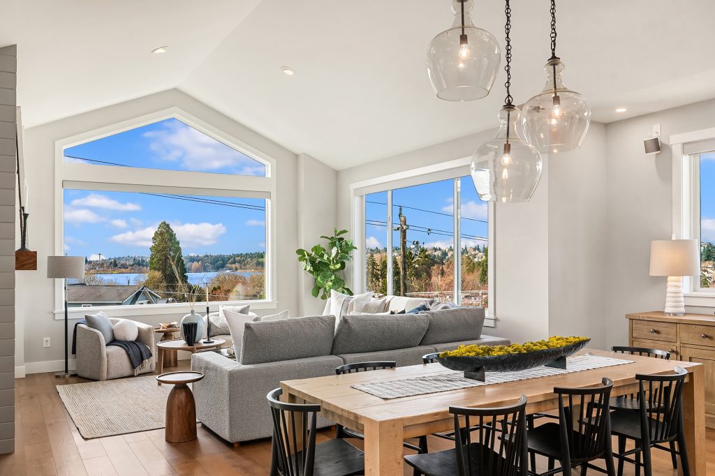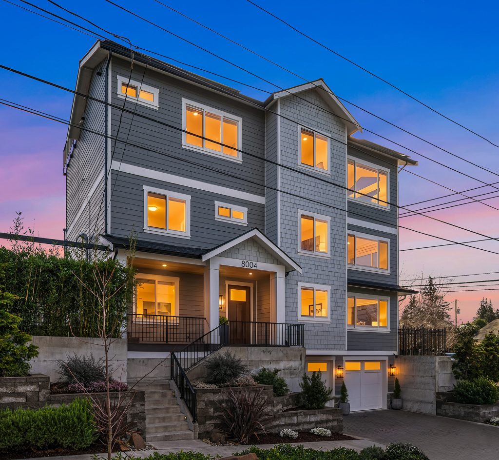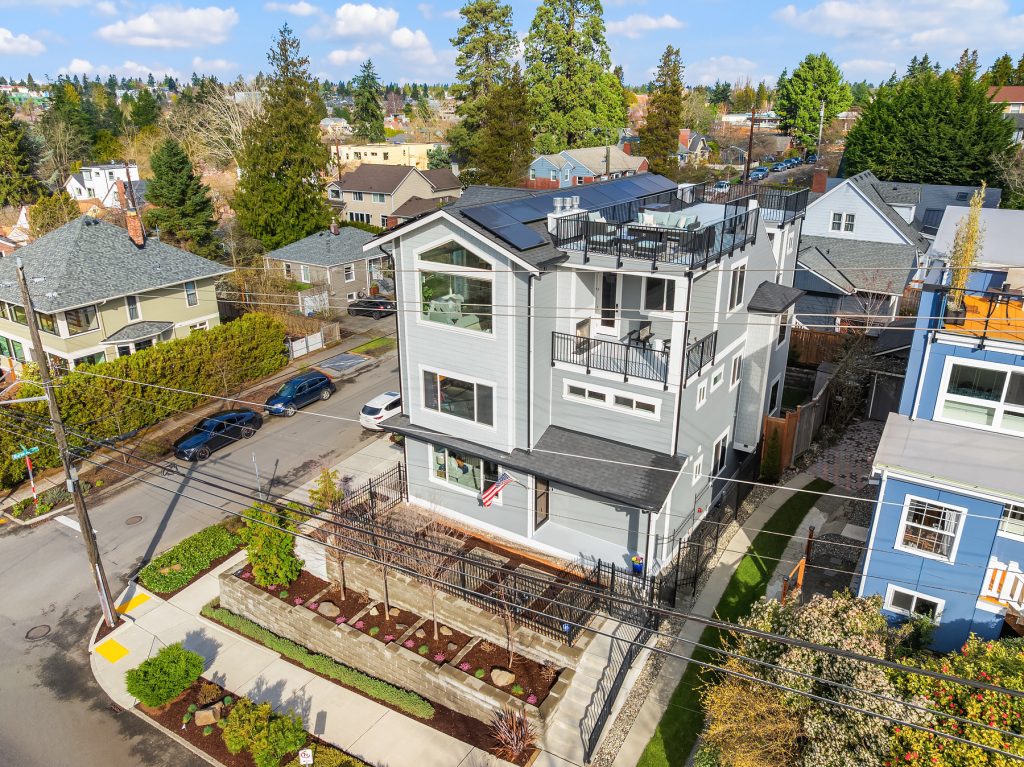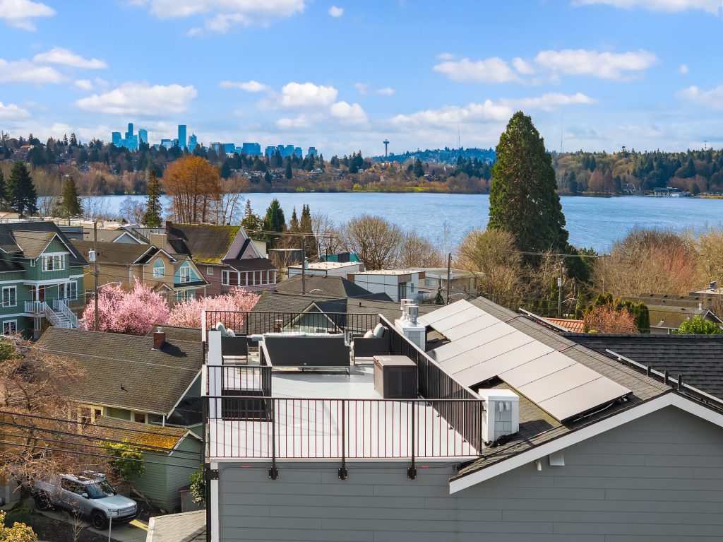 Sitting high off the street with sweeping views of Green Lake, the Skyline & the Olympics this centrally located 2019 custom built Green Lake home features high end finishes, large spaces & a gorgeous ADU perfect for live-in family, guests or rental income. Custom everything in this home from the high end kitchen finishes, built in cabinets/desks/mudroom, a 4-level elevator & added shop off the 2-car garage - everyone gets what they want here! The vaulted ceilings on the top level allow for supersized windows filled with southern light drenching the living room, dining room, kitchen, play space, walk in pantry & half bath. One floor down are the 4 main home bedrooms including a primary suite with views of the lake, fireplace, ensuite bath with heated floors and two walk in closets, a 2nd full bath & laundry are also on this level. The entry level features a laundry/craft/office space, a second office or guest space, a full bath & the 1 bed, 1 bath ADU with separate entrance off 80th. The ADU has high end finishes with granite slab, fireplace, custom cabinets, heated bathroom floors, large walk in closet and laundry hookups. The lower level has a large two car garage (w/ EV hookup) with extra storage/shop, a mudroom with custom built ins & a temperature controlled wine cellar. With a gorgeous roof deck (& solar panels), a patio/grass area and separate garden space off the ADU, there is plenty of outdoor space to enjoy. A block to Green Lake & shops- this home has it all.