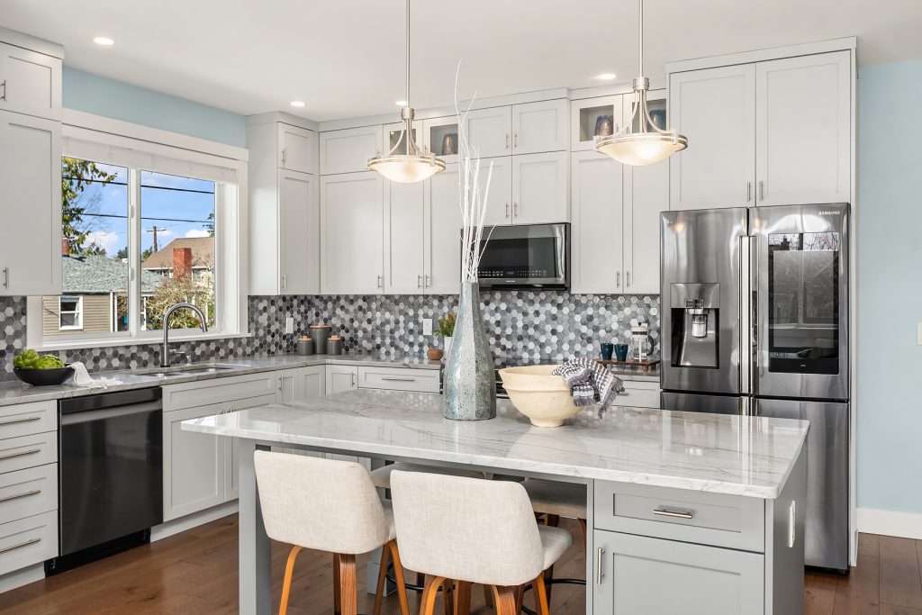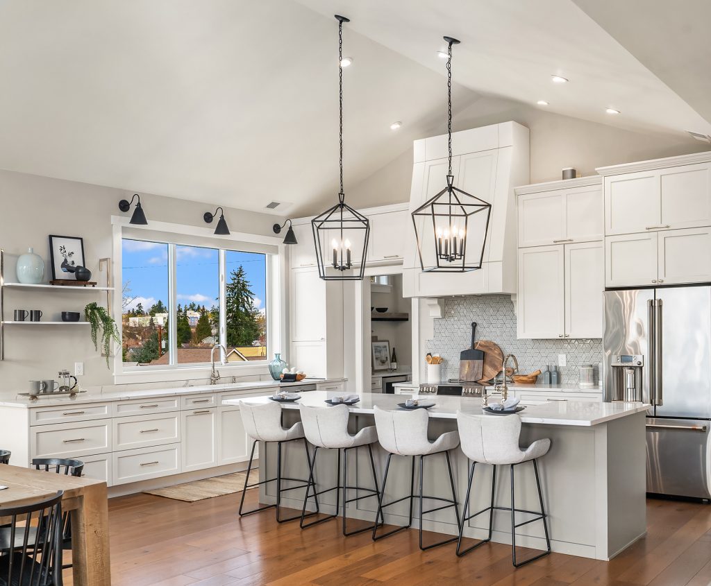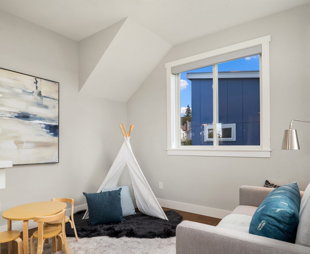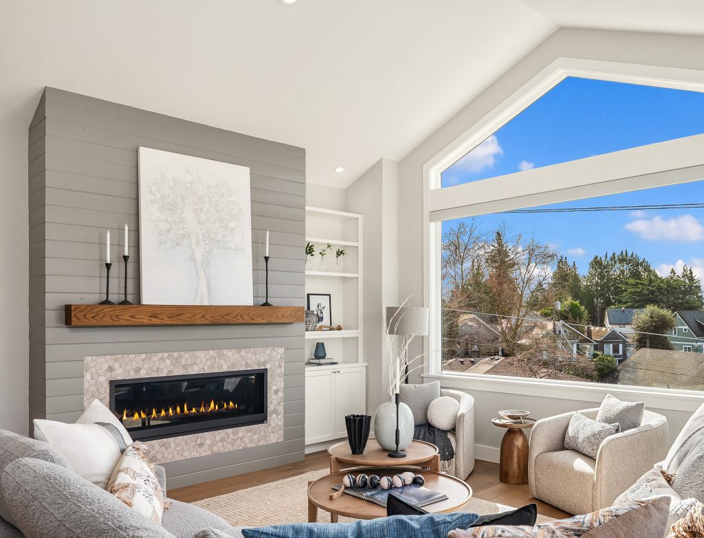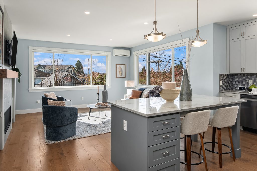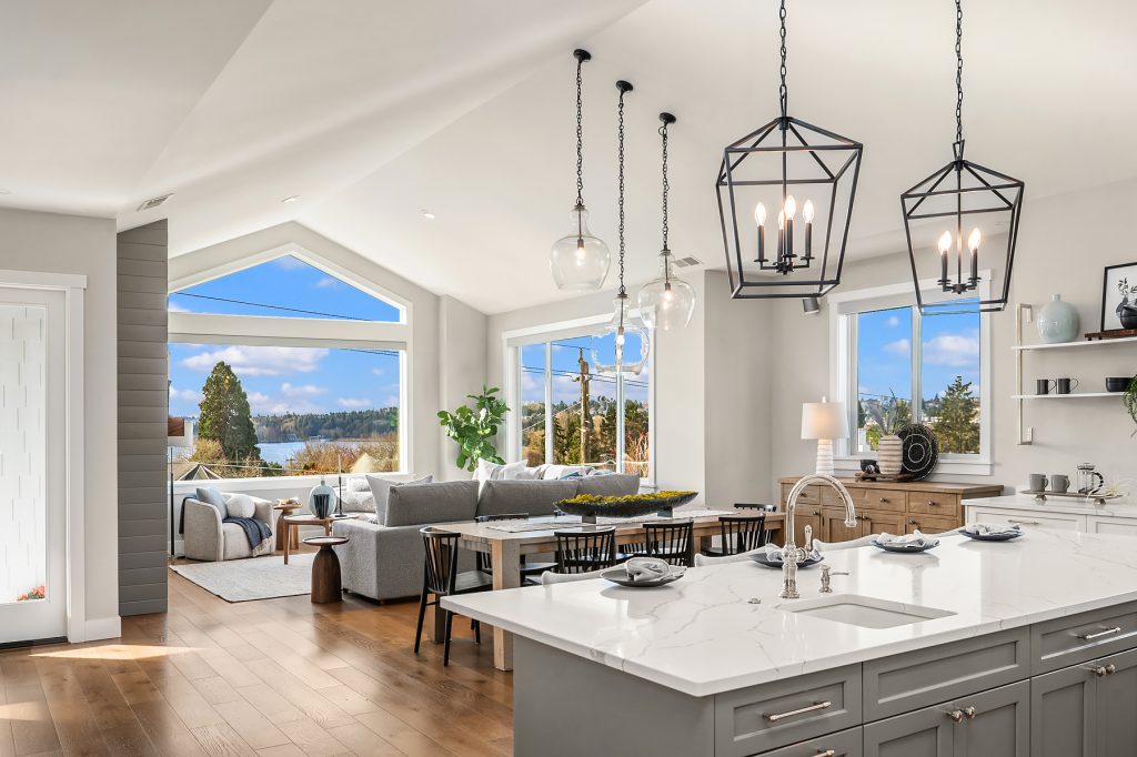 Sitting high off the street with sweeping views of Green Lake, the Skyline & the Olympics this centrally located 2019 custom built Green Lake home features high end finishes, large spaces & a gorgeous ADU perfect for live-in family, guests or rental income. Custom everything in this home from the high end kitchen finishes, built in cabinets/desks/mudroom, a 4-level elevator & added shop off the 2-car garage - everyone gets what they want here! The vaulted ceilings on the top level allow for supersized windows filled with southern light drenching the living room, dining room, kitchen, play space, walk in pantry & half bath. One floor down are the 4 main home bedrooms including a primary suite with views of the lake, fireplace, ensuite bath with heated floors and two walk in closets, a 2nd full bath & laundry are also on this level. The entry level features a laundry/craft/office space, a second office or guest space, a full bath & the 1 bed, 1 bath ADU with separate entrance off 80th. The ADU has high end finishes with granite slab, fireplace, custom cabinets, heated bathroom floors, large walk in closet and laundry hookups. The lower level has a large two car garage (w/ EV hookup) with extra storage/shop, a mudroom with custom built ins & a temperature controlled wine cellar. With a gorgeous roof deck (& solar panels), a patio/grass area and separate garden space off the ADU, there is plenty of outdoor space to enjoy. A block to Green Lake & shops- this home has it all.
